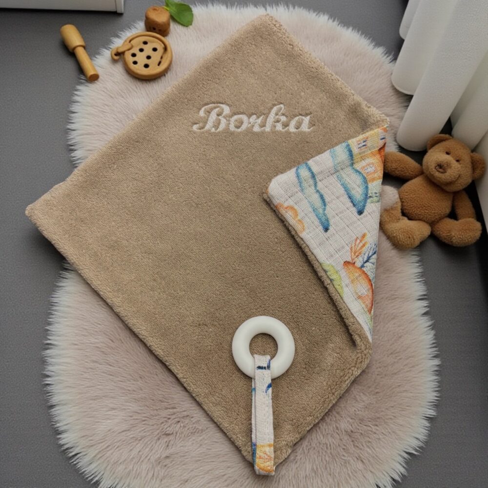 Mogyoróbarna rágókás nyunyóka saját hímzett névvel, BPA-mentes rágókával. Kíméletes a bababőrhöz, megnyugtatja a kicsit fogzás idején, és biztonságos alvótársként kíséri minden kalandban.